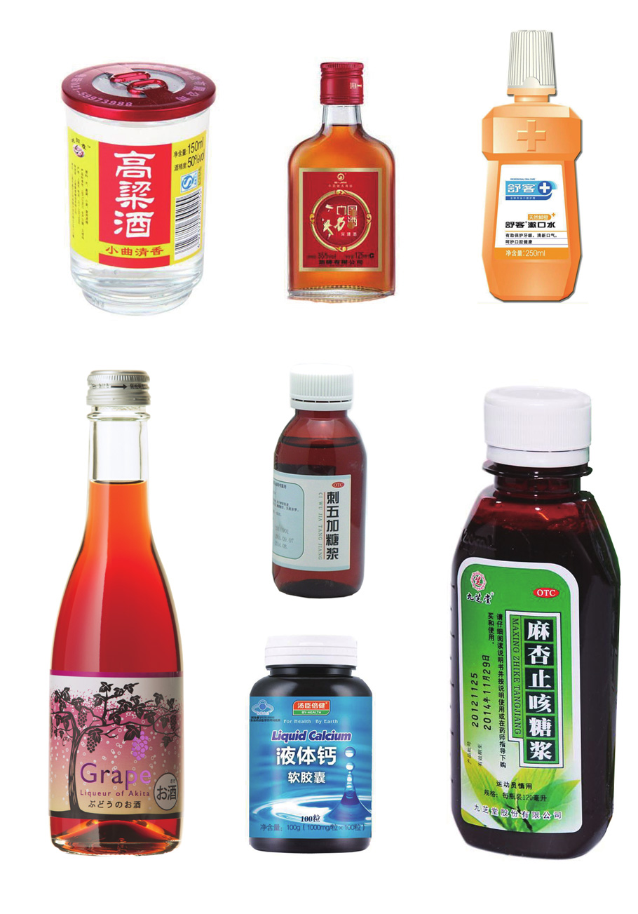 糖浆、保健品、酒、消毒液、漱口水等大剂量溶液的自动理瓶、灌装、旋盖、贴标生产线